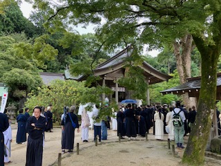 蒸し暑さの中、全国から集った杖道家たちが、流祖・夢想権之助への敬意を込めて奉納演武を披露。神前に響く気合と足捌きは、まるで時を超えて流祖の魂と対話するかのようであった。